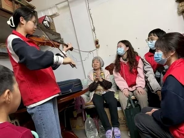 光塔街70多岁的独居长者许姨腰伤卧床,中山大学医学生上门探访,用小提琴拉了一曲《梁祝》。琴声流淌中,老人眼角湿润:“从来没听过这么美的音乐!”
