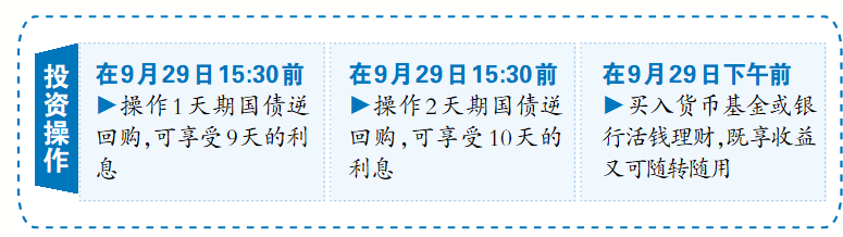 9月29日是国债逆回购的最佳交易时间,投资者可在9月29日15:30前,操作1天期的国债逆回购,可以享受9天的利息;操作2天期的国债逆回购,可以享受10天的利息。