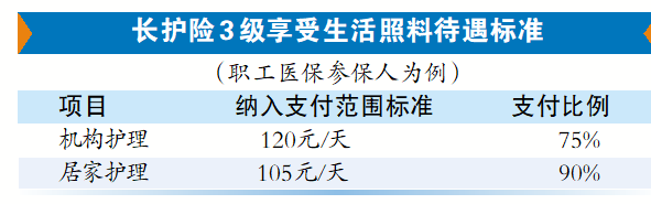 根据评估结果,职工参保人和居民参保人均可享受长护险1级、2级和3级待遇。在支付比例方面,职工参保人员由长护险基金按机构护理75%、居家护理90%的比例支付;居民参保人员由长护险基金按机构护理70%、居家护理85%的比例支付。以享受长护险3级待遇的长期失能人员为例,职工参保人机构护理可享受报销限额为“120元×75%”,实际长护险可支付90元/天。