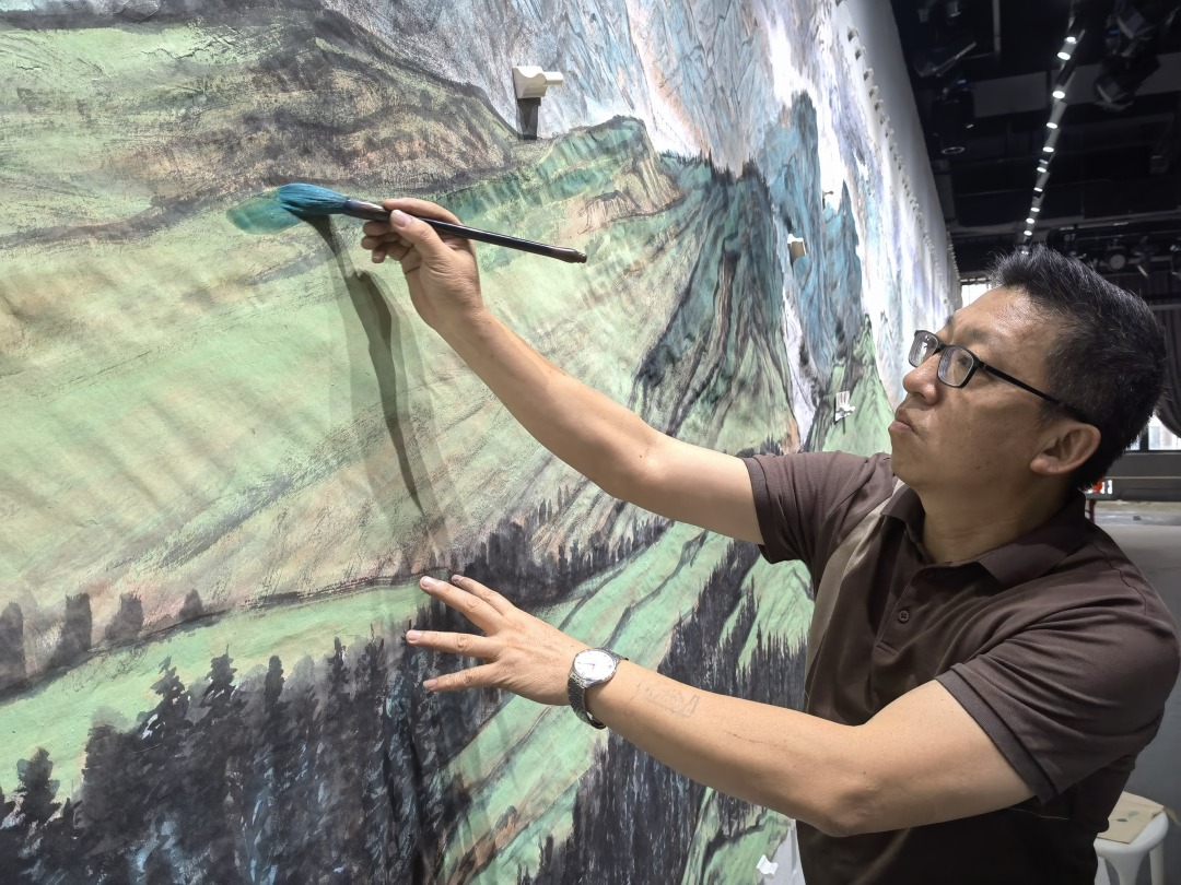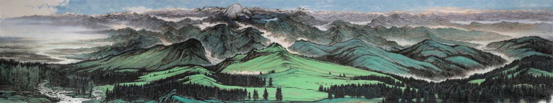 “天山作为新疆的标志性景观,承载了中国多民族融合的历史文化记忆。画面前景青杉起浪,旨在表现经典歌曲意象——天山青杉根连根,各族人民心连心。”他表示,《大美天山》以天山自然景观与新时代民生建设成果为脉络,通过传统笔墨语言展现多民族共生共荣的现代画卷。