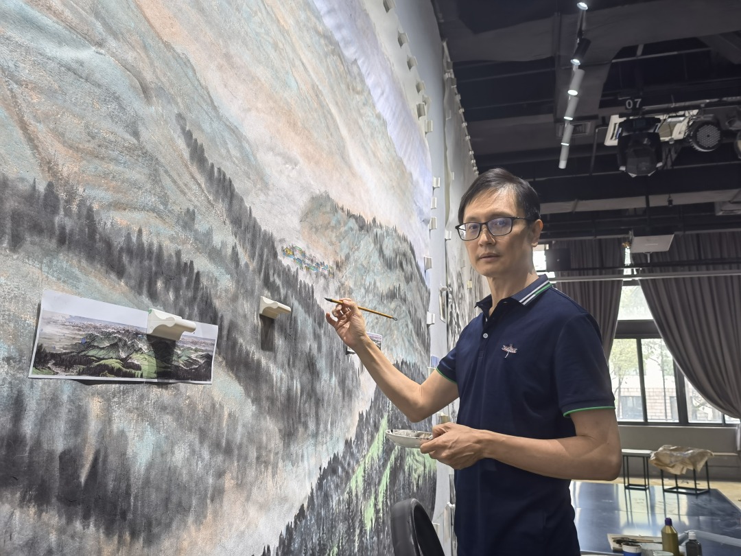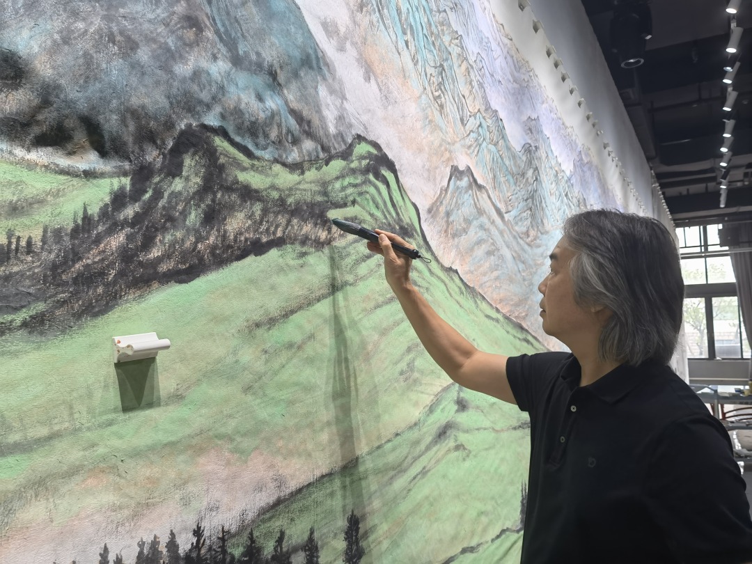 走进广州美术学院的创作室,只见在长16米、高3米的长卷上,碧水似镜的天山天池、巍峨挺拔的博格达峰、穿行在山脉间的兰新高铁、雄伟壮观的果子沟大桥以及牧场、云杉等新疆地标与自然景观尽收眼底,营造出宏大而静谧的美学氛围。