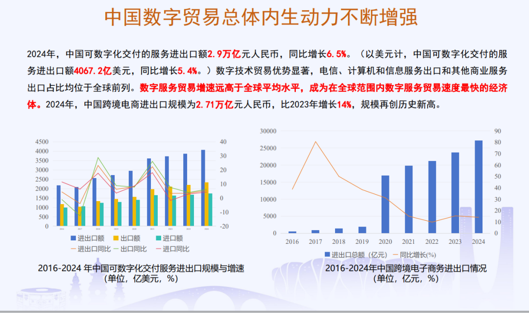 报告数据显示,2024年,中国可数字化交付的服务进出口规模达2.9万亿元人民币,同比增长6.5%;跨境电商进出口2.71万亿元,同比增长14%。2025年上半年,可数字化交付的服务贸易额达1.5万亿元,同比增长6%;跨境电商进出口1.32万亿元,同比增长5.7%,规模创历史同期新高。数字贸易的蓬勃发展不仅为国内经济注入新动力,也为全球数字贸易发展作出了中国贡献。