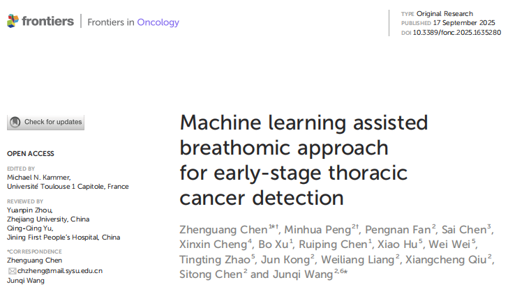 近日,中山大学附属第一医院(以下简称“中山一院”)胸外科副主任陈振光教授团队完成了一项胸部癌症早期检测研究《机器学习辅助的呼气代谢组学方法用于早期胸部癌症检测》(Machine learning assisted breathomic approach for early-stage thoracic cancer detection),该研究首次通过分析呼出气挥发性有机化合物 (VOC) 生物标志物,从而同时实现对于肺癌、食道癌和胸腺瘤的早期检测,这是全球首个基于呼气组学的多种胸腔癌症诊断策略,且其检测性能超越传统血清肿瘤标志物,为胸部癌症无创早诊与全程管理提供了新的解决方案。该研究成果发表于国际肿瘤学期刊《肿瘤学前沿》(Frontiers in Oncology)。