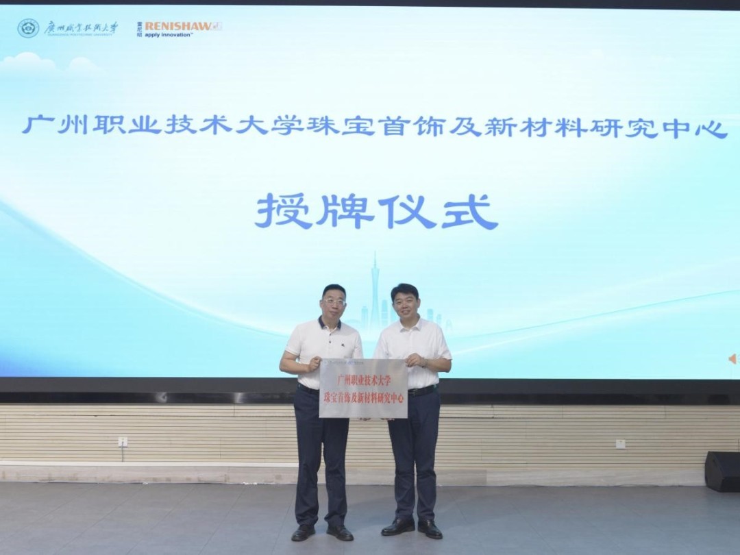 大会上,广职大原“珠宝玉石检测中心”正式升级为“珠宝首饰及新材料研究中心”,标志着该中心与珠宝产业同频的能力跃升。授牌环节由林洽生颁发牌匾,珠宝学院院长李坤作为中心负责人代表揭牌。