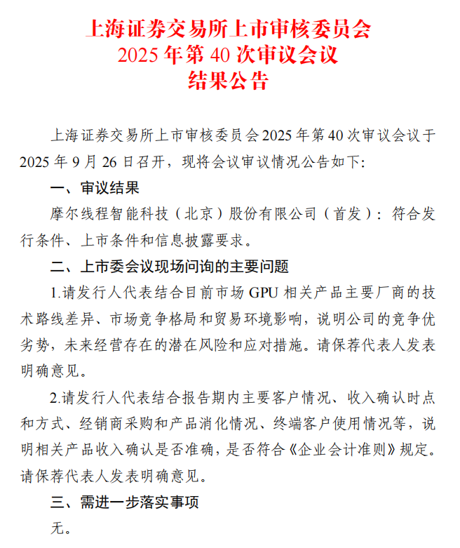 9月26日,上交所上市委发布2025年第40次审议会议结果公告,摩尔线程智能科技(北京)股份有限公司(以下简称“摩尔线程”)首发上市获得通过。