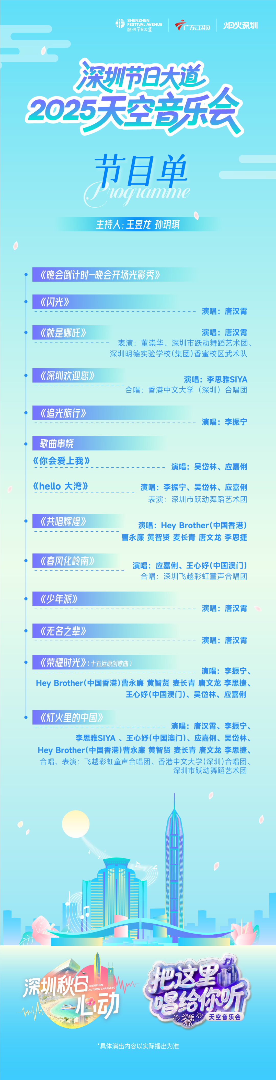 作为福田区双节重磅活动之一,“天空FUN金曲,精彩在福田”深圳节日大道天空音乐会,由广东卫视黄敏丽团队操刀制作,节目聚焦深圳元素与文化符号,以音乐为载体生动讲述深圳故事,向世界传递大湾区声音。