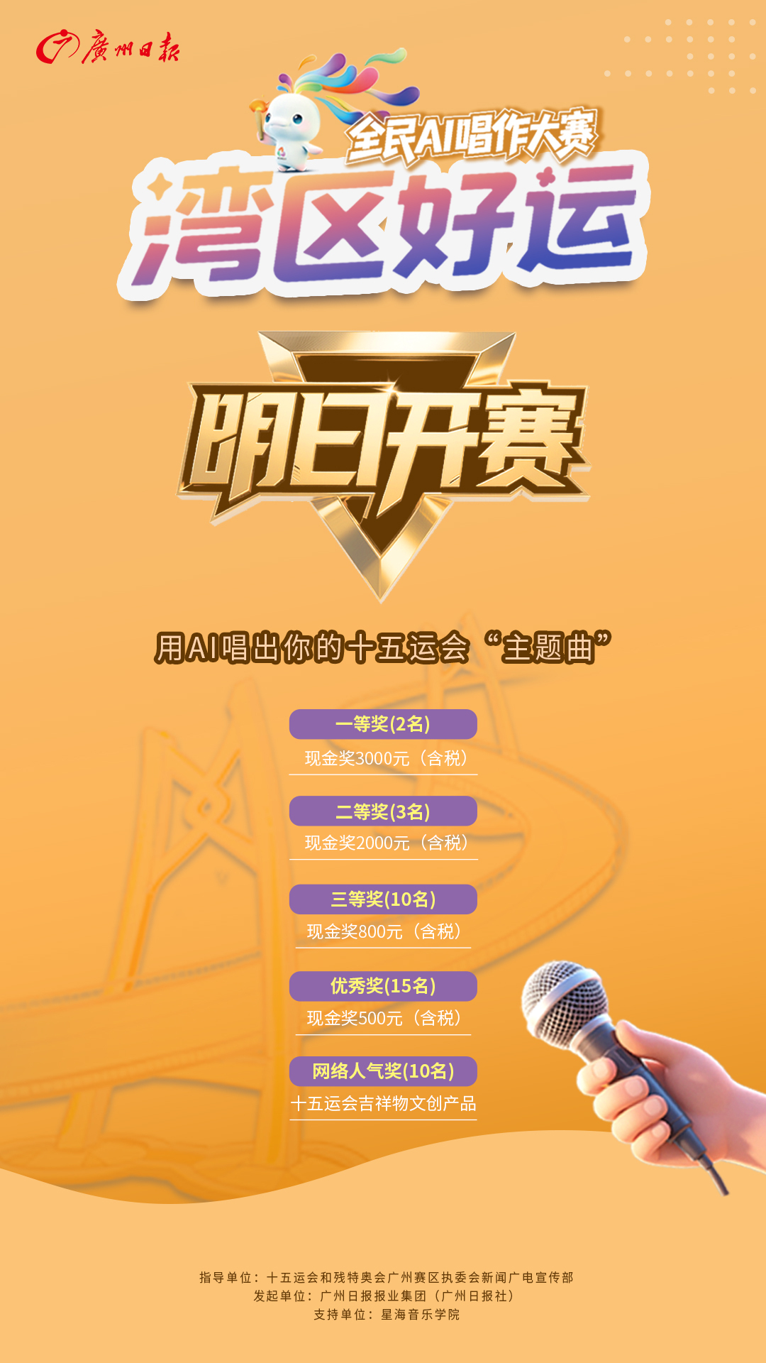 活动将组织音乐专业人士、AI导师等专家组成专业评审团,对创作歌曲进行评选,最终评选出一等奖2名(现金奖3000元,含税)、二等奖3名(现金奖2000元,含税)、三等奖10名(现金奖800元,含税)、优秀奖15名(现金奖500元,含税)、网络人气奖10名(十五运会吉祥物文创产品),参与者可获得总价值约3万元的现金彩蛋。同时,活动开通互动功能,欢迎广大网友为心水歌曲点赞分享,精彩作品和热门歌曲将在广州日报全媒体平台上呈现。