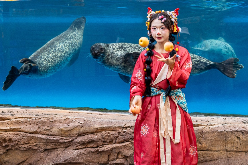 广州海洋馆还特邀广州杂技团献演杂技剧《哪吒闹海·海底龙宫》,将高超技艺与海洋场景完美结合,重现经典神话故事。全新人鱼演艺《嫦娥筑梦》唯美上演,人鱼化身嫦娥演绎海底逐月,致敬中国航天逐梦九天的豪情壮志;《梦启深海·跃动全运》则创新演绎“水中艺术体操”,将体育元素与水下表演巧妙融合,喜迎十五运。国庆特别推出《舞献华彩》系列舞蹈,来自不同朝代的美人穿越到海洋世界,京剧、古典、唐风、民族特色舞蹈轮番上演,以华丽舞蹈献礼国庆。