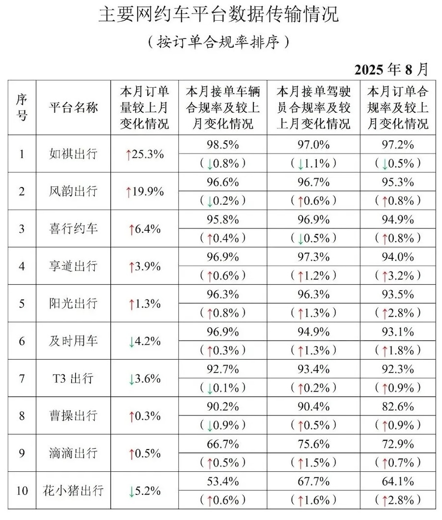 9月26日,国家交通运输部网约车监管信息交互系统于发布了2025年8月份网约车行业运行基本情况,当月共收到订单信息7.89亿单,环比增长0.2%。其中,订单量环比7月增长超过10%的平台有如祺出行、风韵出行;月度订单合规率方面,如祺出行稳居全国第一,继续领导全行业。