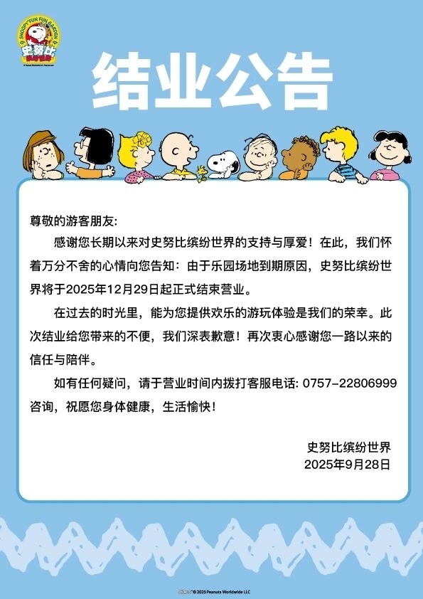 9月28日,位于佛山市顺德区大良街道的史努比缤纷世界发布《结业公告》。公告称,乐园怀着万分不舍的心情向市民游客告知,由于乐园场地到期,史努比缤纷世界将于2025年12月29日起正式结束营业。