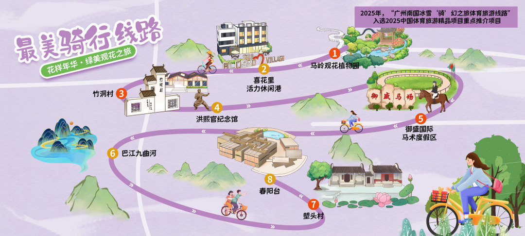 现场发布了广州南国冰雪“骑”幻之旅2025年中国体育旅游精品路线,路线全长45公里,串联花都区“广清穿越 绿美观花骑行道”、中旅·阿那亚九龙湖、广州融创文旅城、芙蓉旅游度假区、北迹露营1号、御盛国际马术度假区等景点,突出冰雪主题,融合滑雪、娱雪、户外登山、徒步、骑行、马术、高尔夫、卡丁车、主题游乐、生态休闲、康养度假、房车帐篷露营、研学等活动,实现体育与旅游强强联动、相互依托,充分满足多层次游客动静相宜、欢乐相融的体育旅游体验需求。