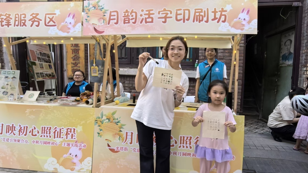 当天下午五时许,活动在热闹的游园会中热闹开场。会场入口处,一盏盏写有谜题的传统纸灯笼随风轻摇,构成了一条充满古风雅韵的“月夜灯谜”长廊。老幼居民或凝神思索、或笑语讨论,猜中者喜笑颜开,换取一盏心仪的彩灯。“猜中了,好开心!灯笼好靓!”居民陈姨举着可爱的兔子灯笼,开心笑道。移步深入,各互动摊位人气爆棚。投壶区内,参与者凝神静气,力求将箭矢精准投入壶中,每一次投中都引来阵阵喝彩,居民张叔一次性投中8次,喜获传统月饼,十分欣喜。而在活字印刷体验区,大人孩子围坐一起,在淡淡的墨香中试“玩”活字印刷,将“花好月圆”“平安喜乐”等中秋美好祝愿印在纸上,也将非遗文化的种子印在心间。“中秋互动体验都很有意思,孩子很喜欢,我们把活字印刷体验卡带回家作为留念,觉得十分难得。”家长刘先生笑说。灯笼DIY区则是一片温馨的创作天地,一个个造型可爱的兔子灯、锦鲤灯在孩子们手中逐渐点亮,在欢声笑语中承载着中秋的美好祝福。