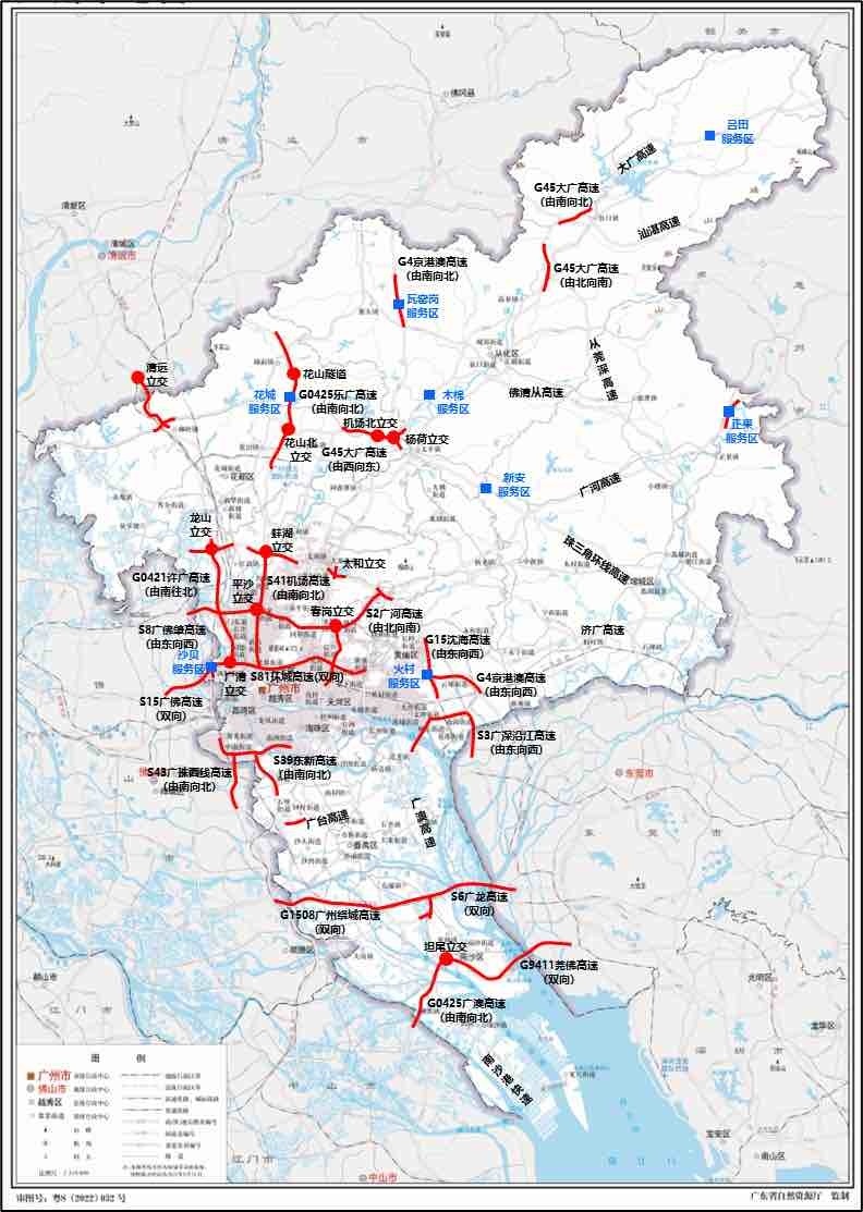 节假日期间,机场高速三元里-蚌湖立交段;乐广高速花山北互通立交-花山隧道段;华南快速路龙洞收费站-春岗立交;莞佛高速坦尾立交-虎门大桥段以及返程高峰时大广高速(机场北立交-杨荷立交)等瓶颈路段车流密集,预计有一定概率出现经常性行车缓慢。