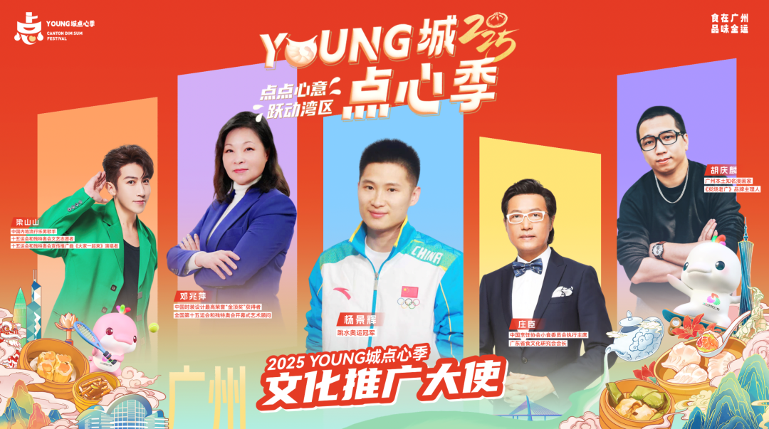 今年点心季特别邀请跳水奥运冠军杨景辉,中国时装设计最高荣誉“金顶奖”获得者邓兆萍,中国烹饪协会小食委员会执行主席、广东省食文化研究会会长庄臣,中国内地流行乐男歌手梁山山,广州本土知名漫画家胡庆麟担任点心季文化推广大使。五位推广大使皆是广州人,他们将以其在不同领域的深厚影响力,共同为家乡粤点文化打Call。