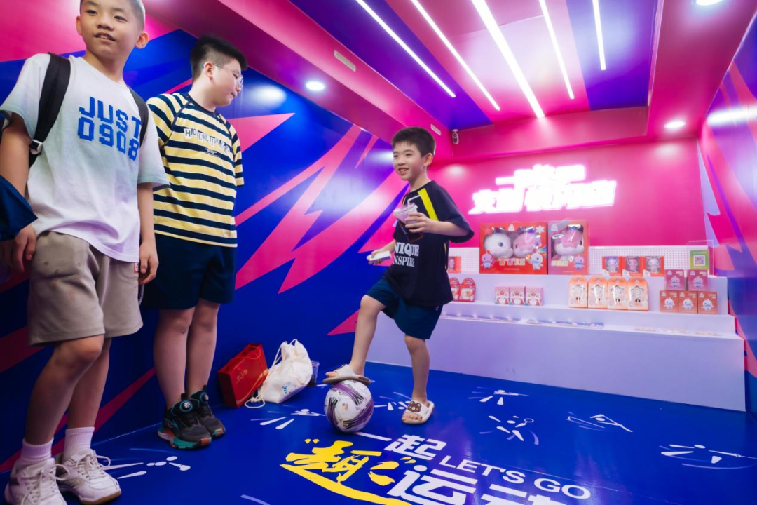 当晚,酷炫的“一起‘趣’运动”全运主题巴士开进园区,迅速成为现场焦点。巴士内部化身“流动全运博物馆”,展示十五运会的火炬、会徽与历届全运知识,互动区则设置了跳绳、足球、原地跑等运动挑战,吸引了不少青年现场比拼,热闹非凡。