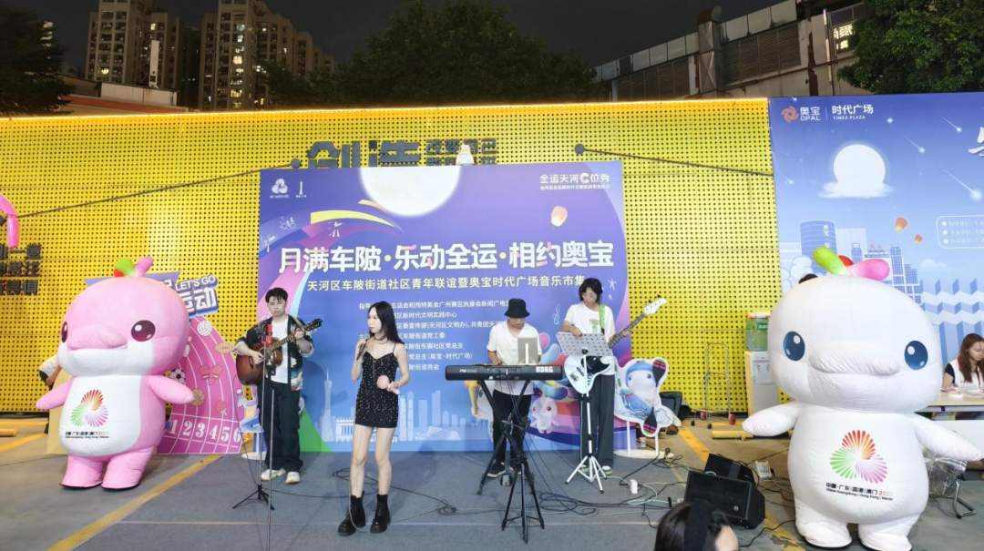 国庆中秋双节同庆。这两天,广州天河区车陂街奥宝·时代广场温馨浪漫的氛围已经拉满。9月27日晚,“一起‘趣’运动”全运主题巴士开进园区,“月满车陂·乐动全运·相约奥宝”天河区车陂街道社区青年联谊暨奥宝时代广场音乐市集活动热辣开场。