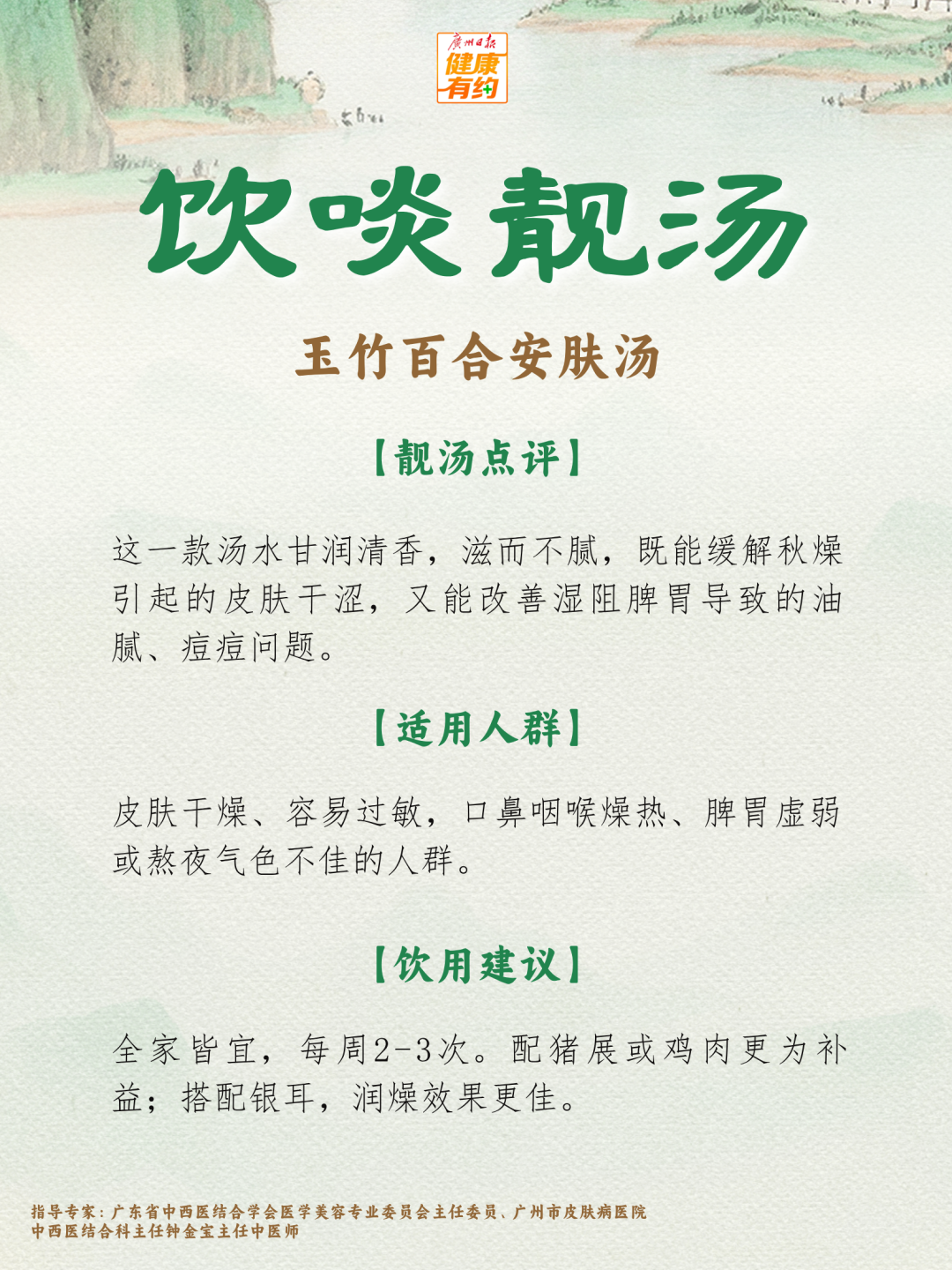 广州市皮肤病医院中西医结合科主任钟金宝主任中医师提醒,广州人爱吃海鲜、喝冷饮,如果再加上熬夜、思虑过多,在这个季节特别容易出现皮肤敏感、气色不佳、乏力倦怠、脾胃虚弱等问题。这时候,最合适来一碗玉竹百合安肤汤,有助于润燥养阴、健脾祛湿、安肤养颜。