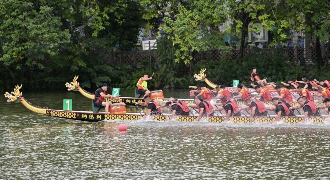 当日下午,镇街男子组竞速赛率先点燃现场热情,在里水河上演了速度与激情。紧随其后的是商企组龙舟赛,16支队伍尽情展现企业家精神,体现了里水“商聚力”十大会长工程的积极赋能。经过激烈角逐,沙涌下沙队成功夺得镇内赛冠军,连续四年夺冠,并斩下镇街赛男子组第三名,里水大步女子一队取得镇街赛女子组第三名,欧维尔智能科技龙舟队获得商企组第一名。压轴环节则为龙舟拔河友谊赛,由机关队与总商会队进行对决,寓意“政企同心、同舟共济”。