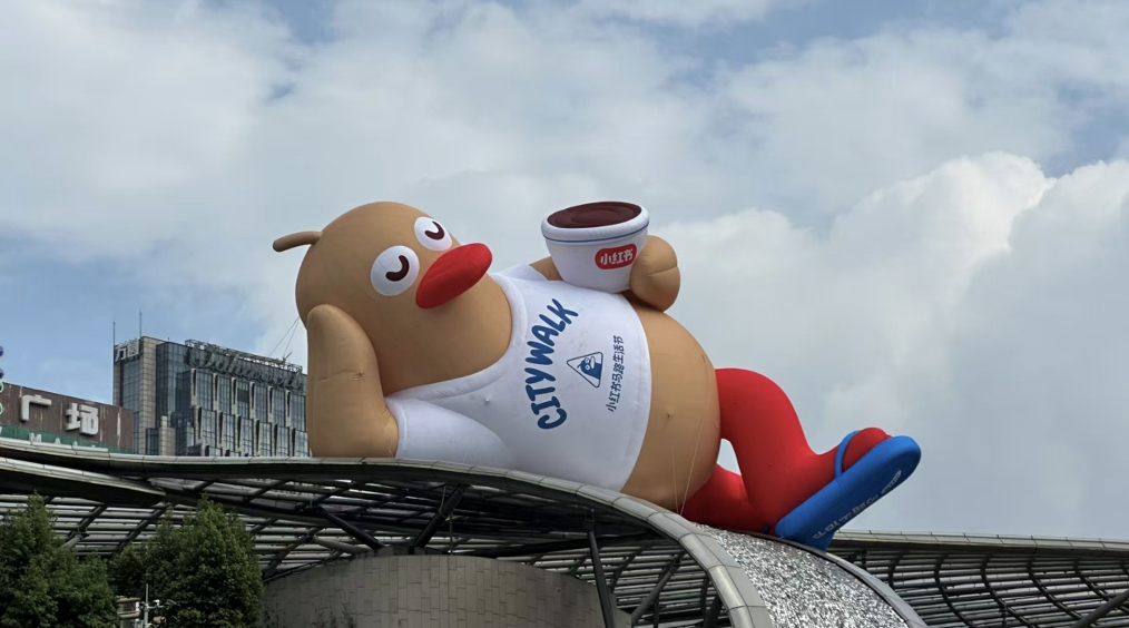 9月27日,广州天环广场上,一只巨型的气模鸭斜躺在屋顶,手里拿着一杯咖啡,脚上趿拉着人字拖。小红书马路生活节吉祥物“鸭马路”在广州的首次亮相,就成为市民争相拍照打卡点,有网友点评,“松弛的生活状态很‘广州’”。