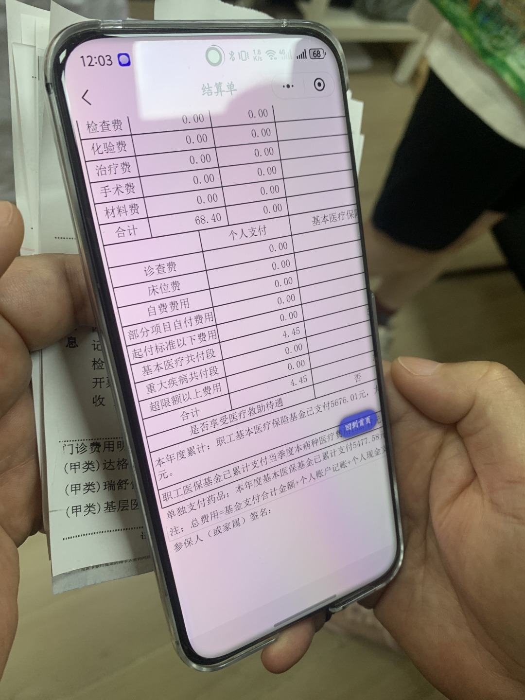 陈女士向记者展示手机上的结算单,68.40元的一盒一类门诊特定药品,通过外配处方方式在定点零售药店实现统筹结算,个人支付金额为4.45元