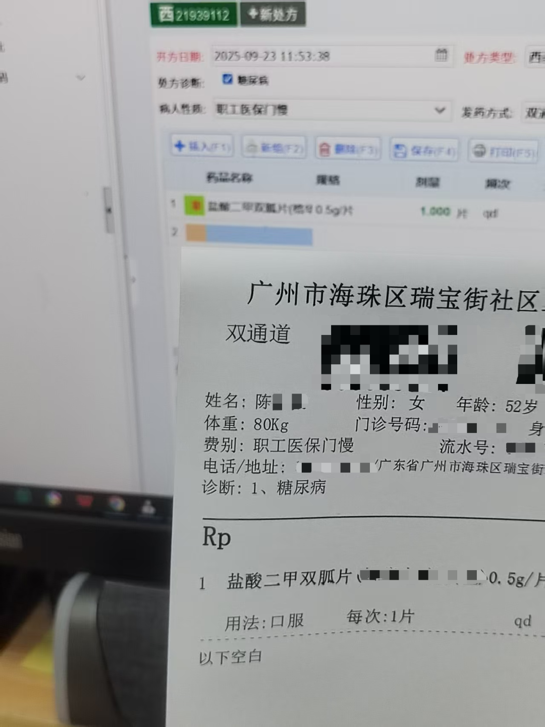 “因为我知道之前进口的二甲双胍在基层是很少有的。在李医生提议我也换成这种药后,我下意识的反应是,我要去各个线上购药平台找一下、再去家附近的药房找一下。但是李医生就和我说,你直接过来找我,我们医院有一个‘双通道’,我们一起试一试。”陈女士回忆,“在手机上验证处方,选择药房、比价,选择自取还是快递到家,整个过程都很顺畅。我人还没回到家,药已经在楼下的药房准备好放在柜台。”对于广州推出的一类门特外配处方服务的新政策,她赞不绝口:“我真没想到过,六七十块的药,最后我自费的钱只是4块钱。对于我们慢性病患者,真的很方便、很实惠!”