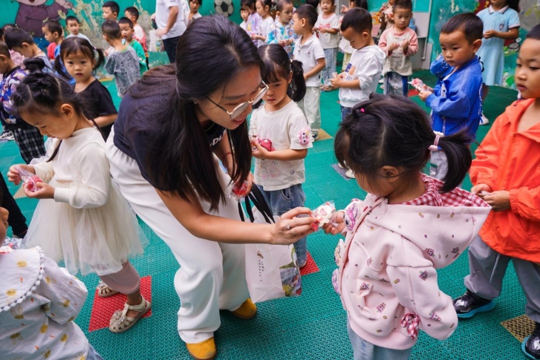 爱心员工代表与重庆市彭水县桑柘镇启明星幼儿园孩子互动。2024年,联劝公益团队深入一线乡村民办幼儿园调研后发现,超过20%的幼儿园不提供餐点,儿童在校蛋类摄入达标率低至6.1%。本次“一个鸡蛋的力量”公益项目落地重庆山区乡村幼儿园,通过每日为儿童提供一个鸡蛋,持续一年的供给,意在优化其膳食结构,并配合每月营养健康课程与定期监测机制,持续对关爱儿童进行健康监测和关注。
