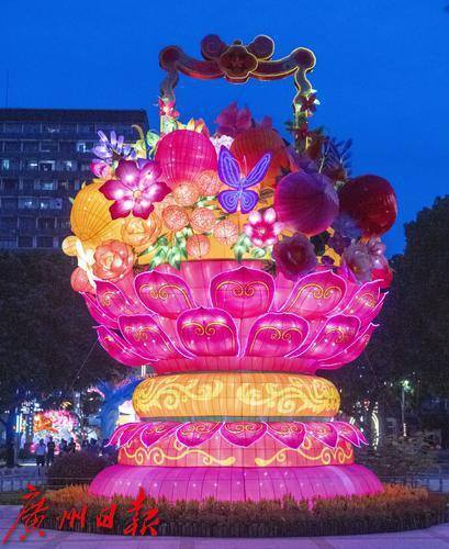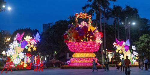 公园中心广场上的灯组高达10米,以鲜花与岭南佳果为创作主体灯。