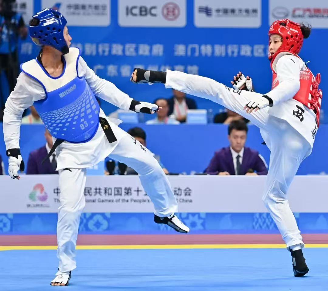张楚玲(右)在十五运会跆拳道女子-57公斤级决赛中。