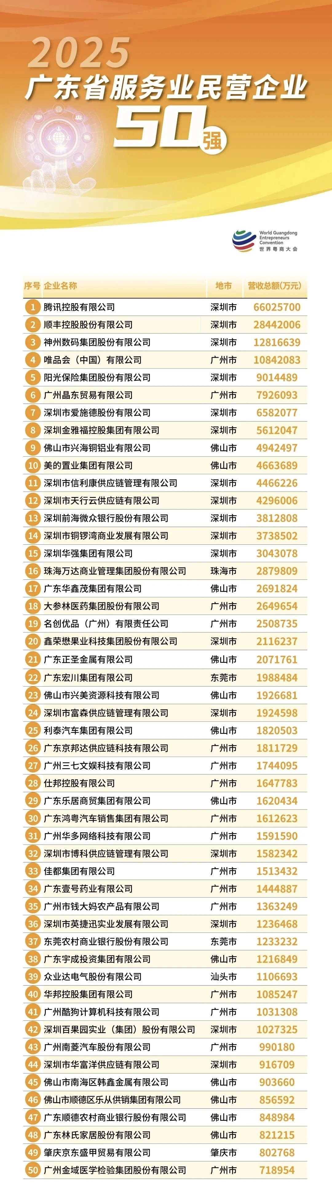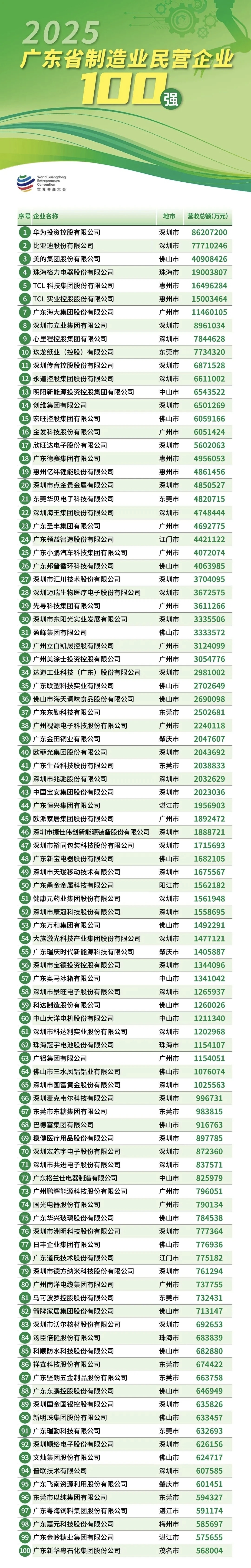 记者获悉,2025年省工商联开展广东省上规模民营企业调研排序工作。由企业自愿申报并以2024年企业营业收入为基本标准,以企业会计年表为依据,经有关部门审核排序,产生“2025广东省民营企业100强”“2025广东省制造业民营企业100强”“2025广东省服务业民营企业50强”三个榜单。