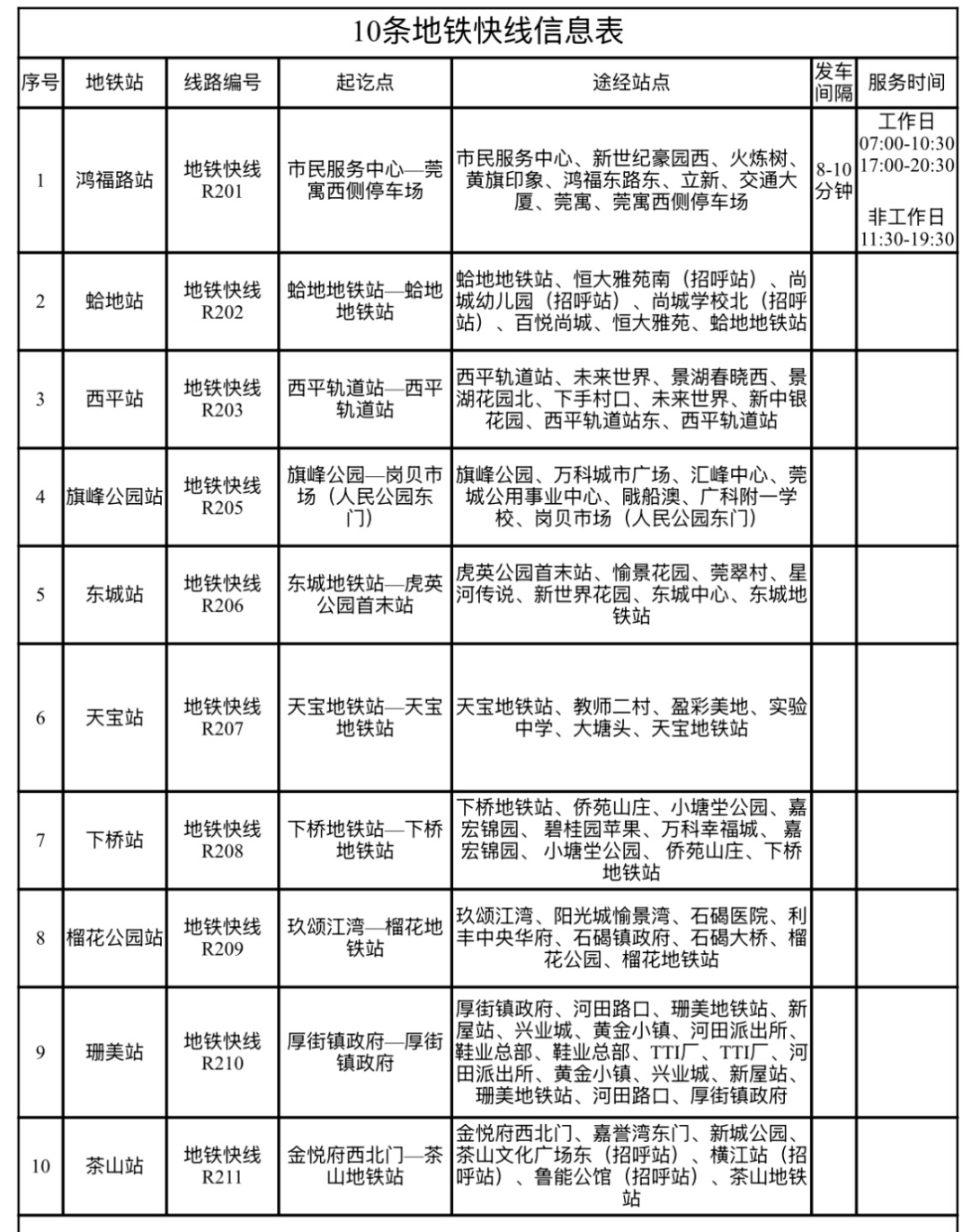 本期试点开通的10条地铁快线主要接驳2号线的东城站、鸿福路站、西平站等核心站点,覆盖中心城区及周边厚街、茶山等多个镇街的大型社区。线路规划紧密围绕轨道站点周边的社区、学校、医院等客流集散点,最大限度缩短乘客步行距离。