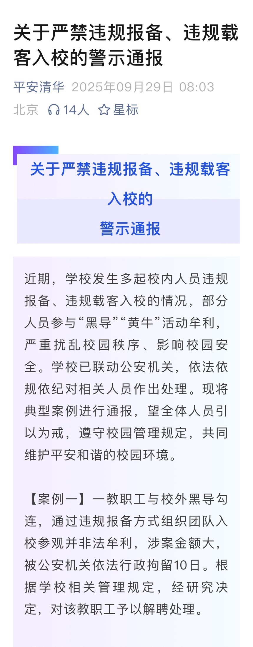 《通报》称,近期,清华大学发生多起校内人员违规报备、违规载客入校的情况,部分人员参与“黑导”“黄牛”活动牟利,严重扰乱校园秩序、影响校园安全。清华大学已联动公安机关,依法依规依纪对相关人员作出处理。