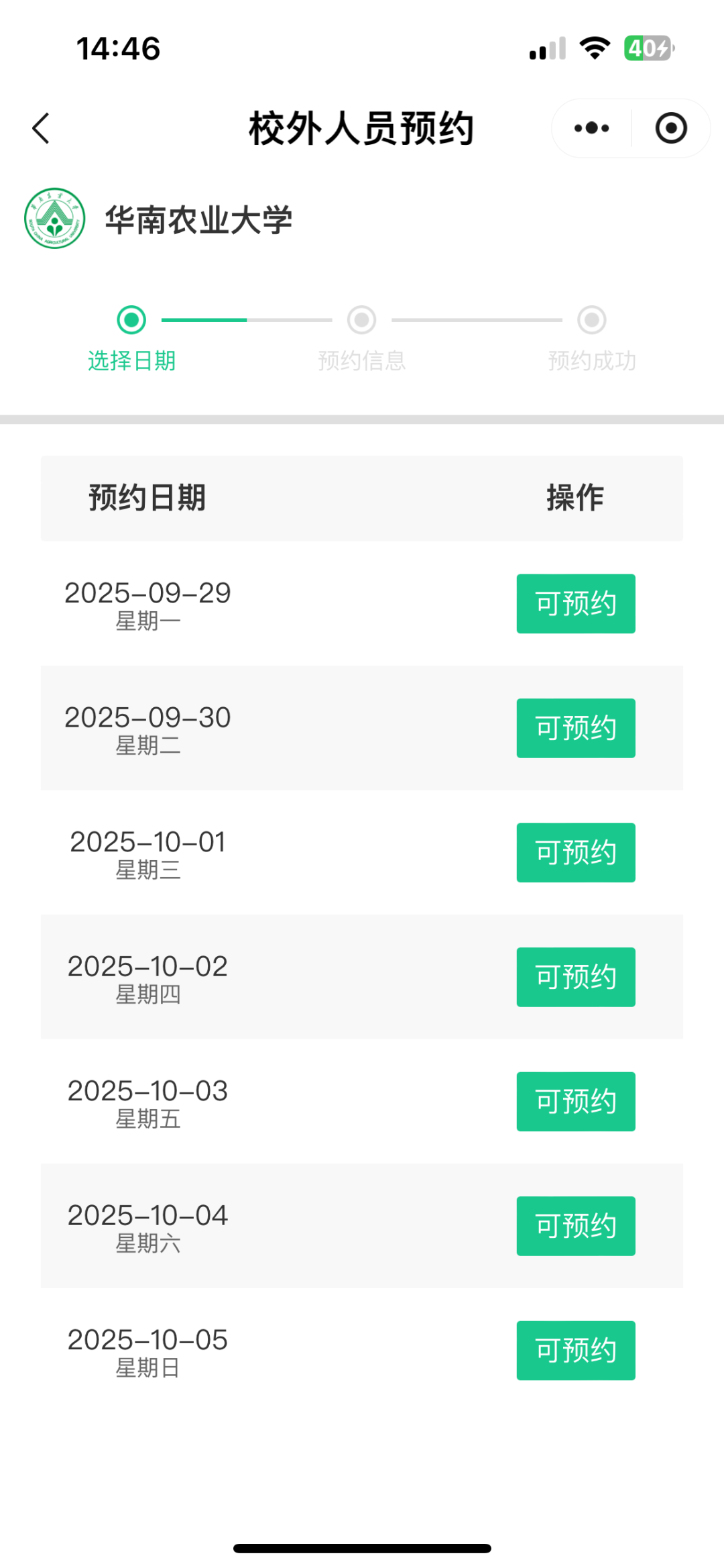 社会公众可关注“华南农业大学”公众号,点击“服务”—“来访预约”,进入预约小程序,如实填写信息。预约成功后,在预约进入校门刷身份证,核验后即可进入校园。