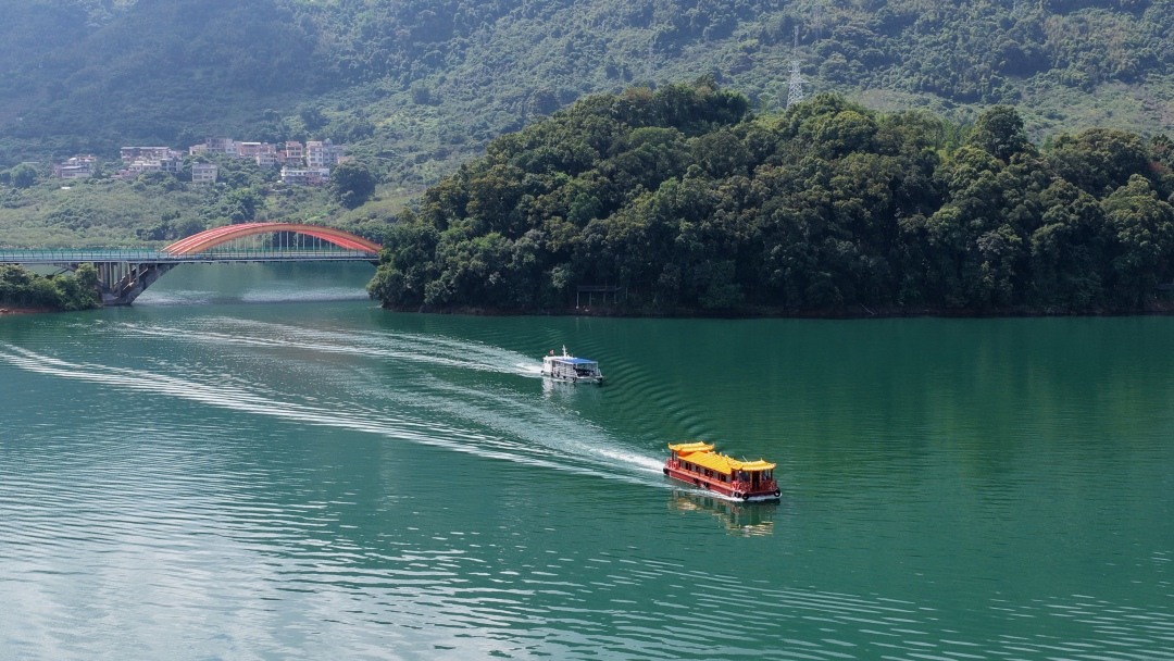 据介绍,游船航线从公园码头启航,全程约30分钟,航线串联起流溪湖的核心美景:13.39平方公里的清澈水域碧波荡漾,如一块巨大的翡翠;原生态的岸线林木葱茏,构成天然的绿色长廊;22座大小岛屿如明珠般散落湖中,步步皆景。此外,景区游船采用360°全透明观景设计,方便游客观赏和拍摄山水美景,仿古造型重现江南风韵,船头设有茶座,游客可迎风品茗。