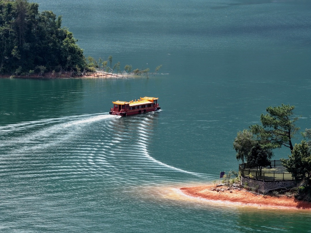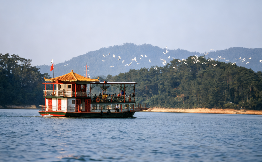 游客登船后,可欣赏到沿湖蜿蜒9公里的亲水栈道,以及光头岛、猴岛、亲子岛等岛屿如翡翠般点缀湖面。其中,白鹭岛是航线的核心景观。每年秋季,成群白鹭从北方迁徙而来,洁白的身影与青山碧水相映成趣,构成“一行白鹭上青天”的动人画卷。当航线进一步延伸至开阔水域,远眺形似卧牛的黄牛山轮廓分明,而沿途的流溪河水库大坝更显雄伟,这座大坝集防洪、灌溉、发电与旅游等综合功能于一体,实现了生态之美与工程之力的完美融合。