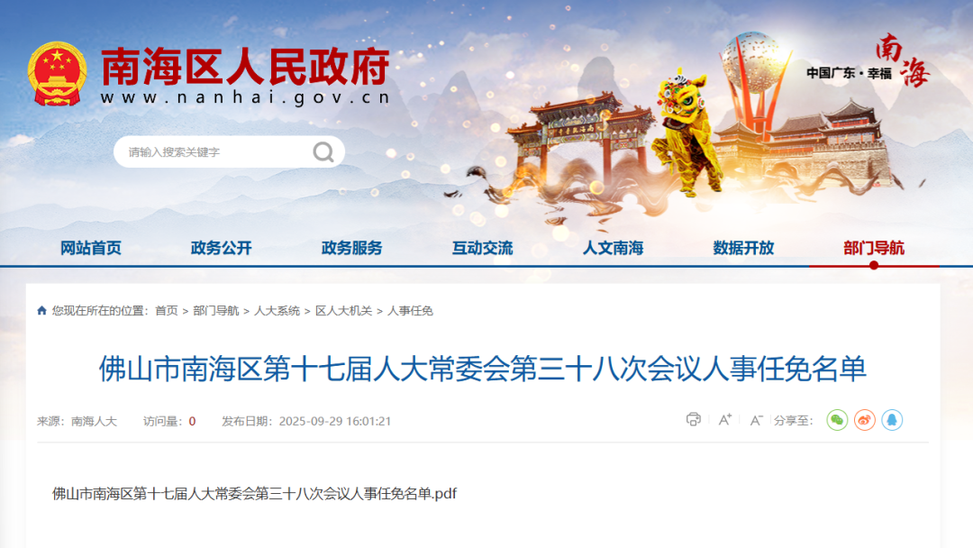 9月29日下午4时,南海区人大发布了最新一期人事任免信息。