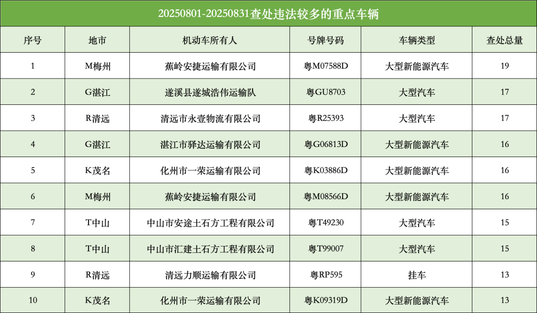 本次曝光违法次数较多的重点车辆包括蕉岭安捷运输有限公司的粤M07588D、遂溪县遂城浩伟运输队的粤GU8703、清远市永壹物流有限公司的粤R25393等10辆重点车辆。其中,蕉岭安捷运输有限公司的粤M07588D违法次数最多,一个月高达19次,其主要违法行为是违停和疲劳驾驶;遂溪县遂城浩伟运输队的粤GU8703和清远市永壹物流有限公司的粤R25393紧随其后,一个月的违法次数达17次。