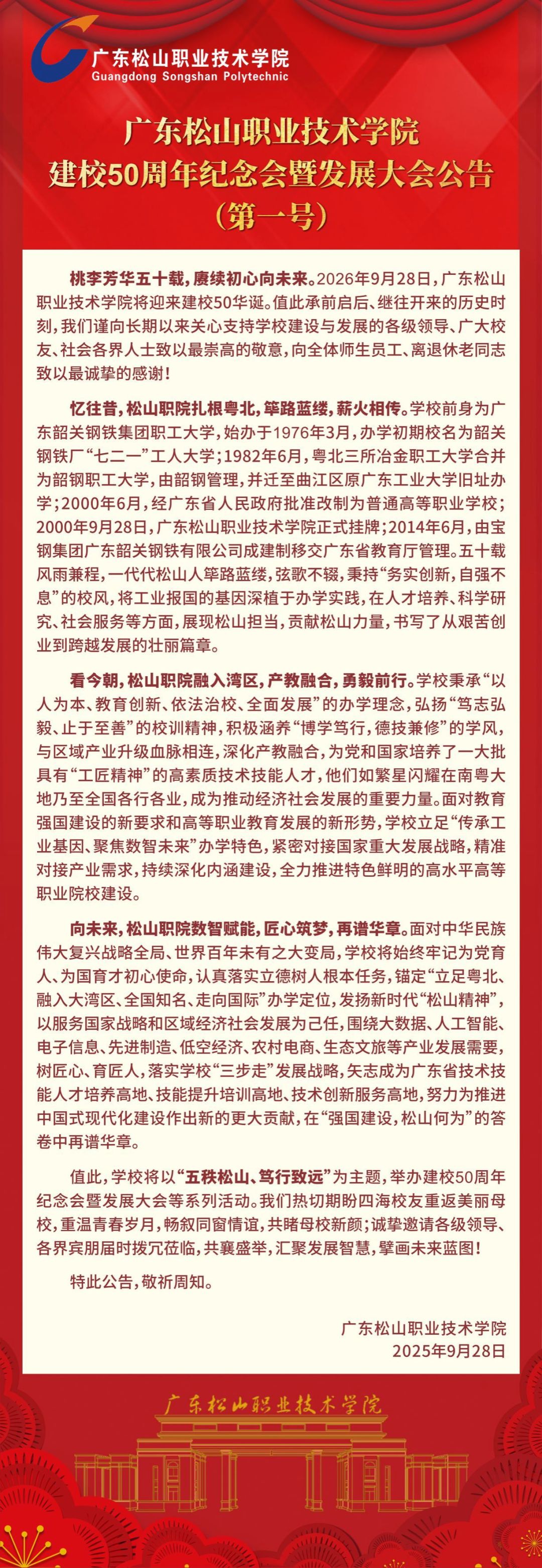 9月28日,广东松山职业技术学院在曲江校区举行建校50周年纪念会暨发展大会倒计时一周年启动仪式。仪式上,该大会一号公告、标识、主题正式发布。