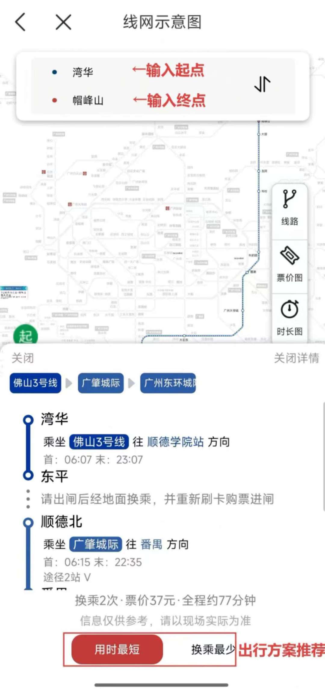 9月29日,佛山地铁宣布,随着广东城际多条新线的开通,佛山地铁App、佛山地铁乘车码微信小程序的广佛“地铁+城际”线网图同步升级更新,广清城际、广州东环城际、广肇城际、广惠城际和琶莲城际也融入线网图中。市民进入线网图后输入起点和终点,系统会自动推荐“用时最短”或“换乘最少”的“地铁+城际”出行方案,还可查看换乘次数、票价、行程时间等信息。此外,APP还支持出口资讯(含出入口公交车信息)、车站服务设施(如专用电梯、卫生间、母婴室)等拓展信息查询。