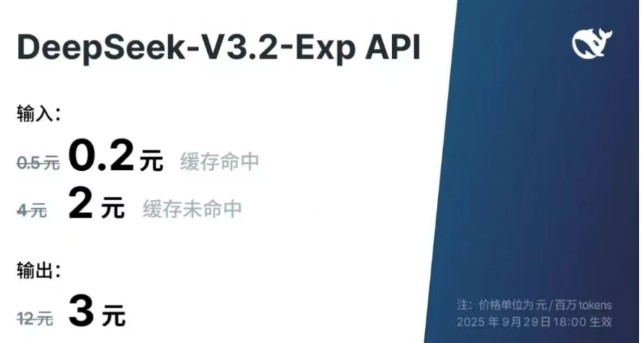 得益于新模型服务成本的大幅降低,官方 API 价格也相应下调,新价格即刻生效。在新的价格政策下,开发者调用 DeepSeek API 的成本将降低50%以上。目前API的模型版本为 DeepSeek-V3.2-Exp,访问方式保持不变。