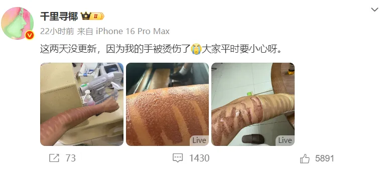 近日,一名网红博主在某医美机构接受手部光子嫩肤,但术后不久即出现剧痛,就医确诊为二度烧伤,医生表示可能遗留永久性瘢痕。她在微博上公开了受伤照片,并提醒广大网友“做医美要慎重”,相关话题登上了热搜,引起网友热议。