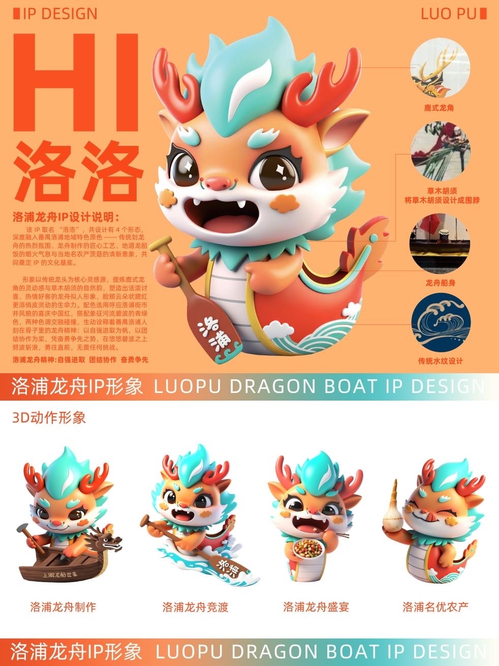 IP赋能,打造文化符号。洛浦街推出洛浦龙舟IP形象“洛洛”,以传统龙头为灵感,融合鹿角、云纹腮红等元素,搭配“龙舟橙”、中国红、青绿色调,生动诠释洛浦人奋勇争先、团结协作的龙舟精神。IP设有4种形态,分别对应划龙舟、龙舟制作、龙船饭、本土名农产茨菇等文化意象,成为传播龙舟文化的重要视觉载体。