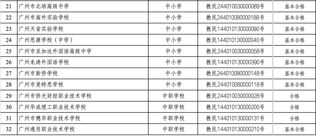 此次年检共有28所民办中小学参与,其中17所民办学校的年检结论为“合格”,11所民办学校的年检结论为“基本合格”;另有4所中职学校参与此次年检,其中1所中职学校年检结论为“基本合格”。