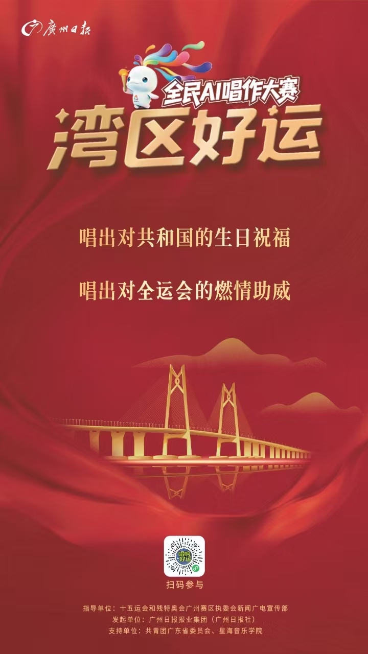 在中华人民共和国迎来76周年华诞之际,让我们用歌声传递对新中国的生日祝福,唱出对祖国的深情告白!扫描海报上的活动二维码或通过广州日报微信下拉菜单、广州日报新花城客户端活动专页,即可进入广州日报“湾区好运”AI音乐创作平台生成属于自己的音乐作品,更有总价值约3万元的现金彩蛋和十五运会吉祥物文创产品等你来拿。