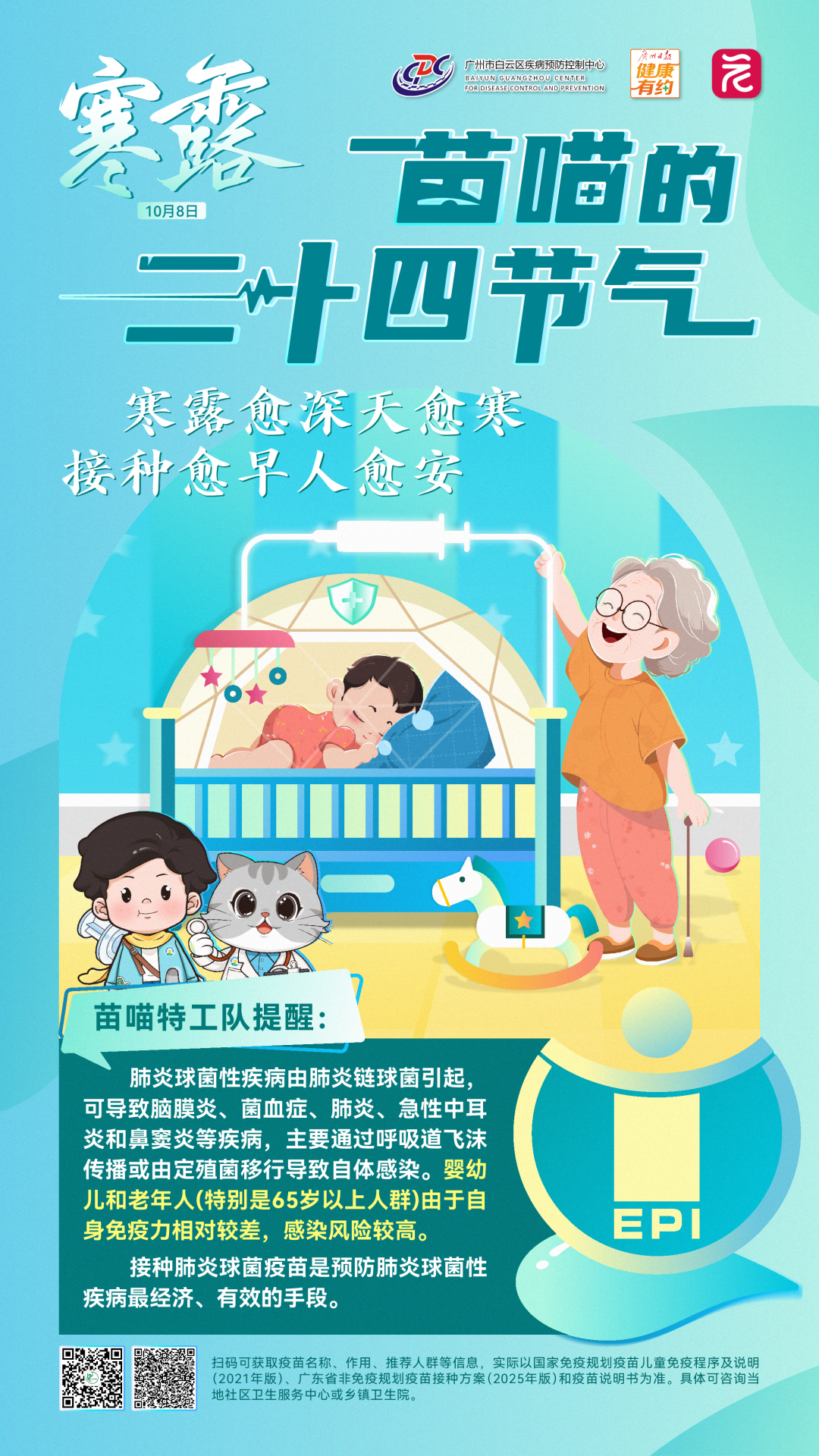 如何科学预防,远离威胁?广州市白云区疾病预防控制中心预防接种科普IP“苗喵特工队”提醒:接种肺炎球菌疫苗是预防肺炎球菌性疾病最经济、有效的手段。特别是对于免疫力低下的“一老一小”等免疫力较弱的人群,更加推荐通过接种疫苗的方式来预防。