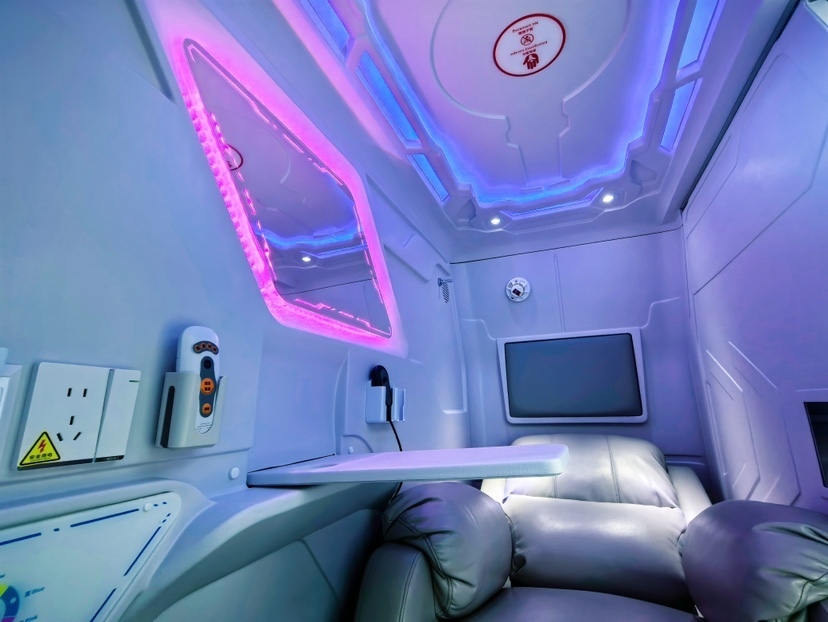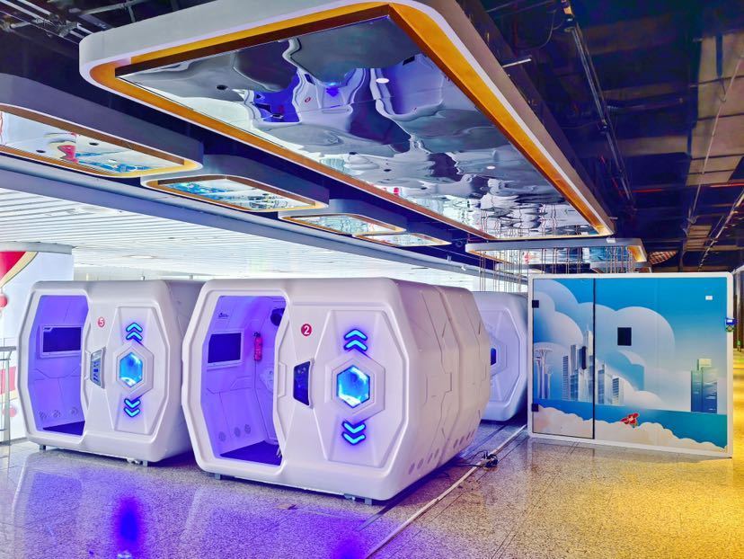设计上,白云机场创新性地将科技感与航空主题深度融合,每个休息舱采用模块化智能设计,旅客可自主调节灯光色温,从日出暖光到极夜冷光的切换能有效缓解时差带来的疲劳感,舱体选用隔音材料搭配隐私玻璃窗,关门后私密性拉满,即使身高1.8米的旅客也能舒适平躺。