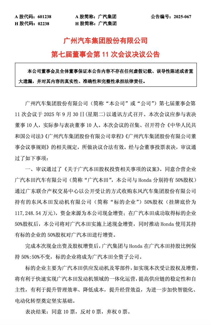 完成此次现金出资及股权增资后,广汽集团与本田在广汽本田持股比例保持50%:50%不变,标的企业将成为广汽本田全资子公司。分析认为,此次收购获得股东方的全力支持,将有助于广汽本田降本增效,加快智电转型。