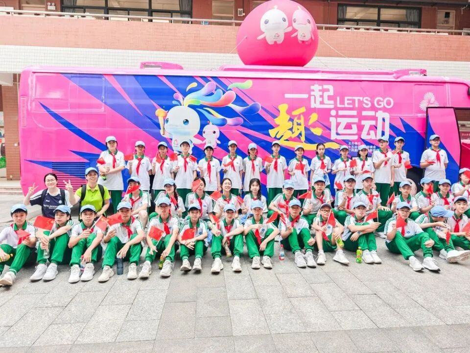 作为“全民迎全运”系列活动的重要载体,“一起‘趣’运动”全运主题巴士也开进了九十七中校园。这辆集参观讲解、互动体验、趣味打卡于一体的潮流巴士,以其充满活力与时尚感的设计,成为校园里一道亮丽的风景线。师生们纷纷登上巴士,通过多媒体展示、互动设备等,沉浸式感受全运氛围。