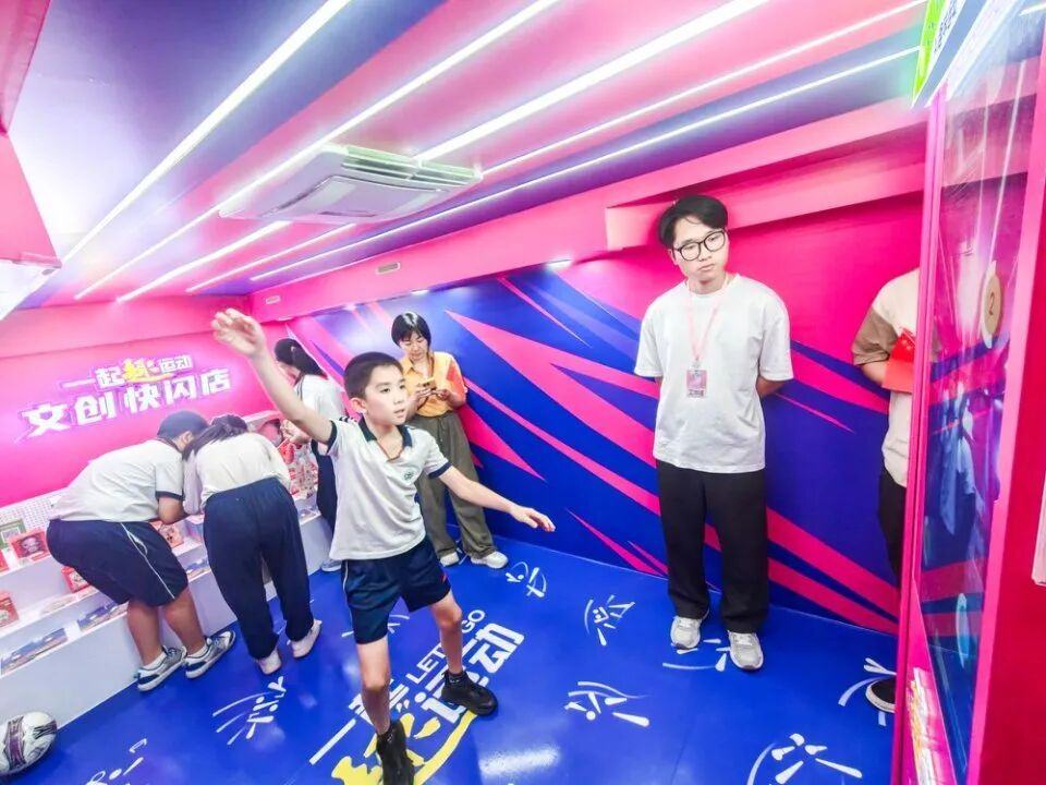 学生与“一起‘趣’运动”全运主题巴士合影、体验车上游戏。