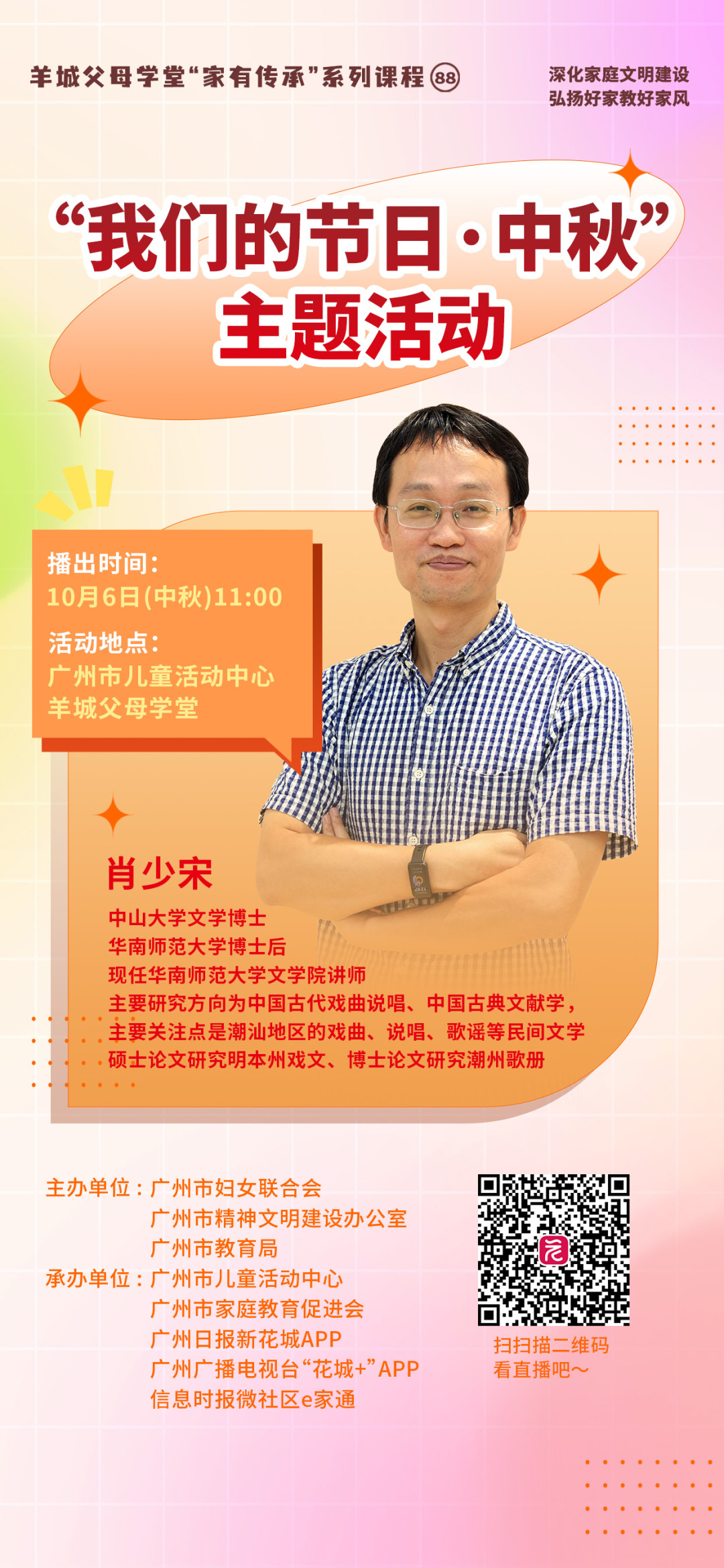 信息时报讯(记者 郭展鹏)作为承载着千年文化与家庭温情的传统节日,中秋藏着太多值得与孩子分享的故事。不少家长想带娃深入了解,却不知从何说起?别担心,广州市妇联、市精神文明建设办公室、市教育局通过羊城父母学堂“家有传承”系列课程活动,举办“我们的节日·中秋”主题活动,带你和孩子一起读懂中秋的“前世今生”,在文化浸润中拉近亲子距离!