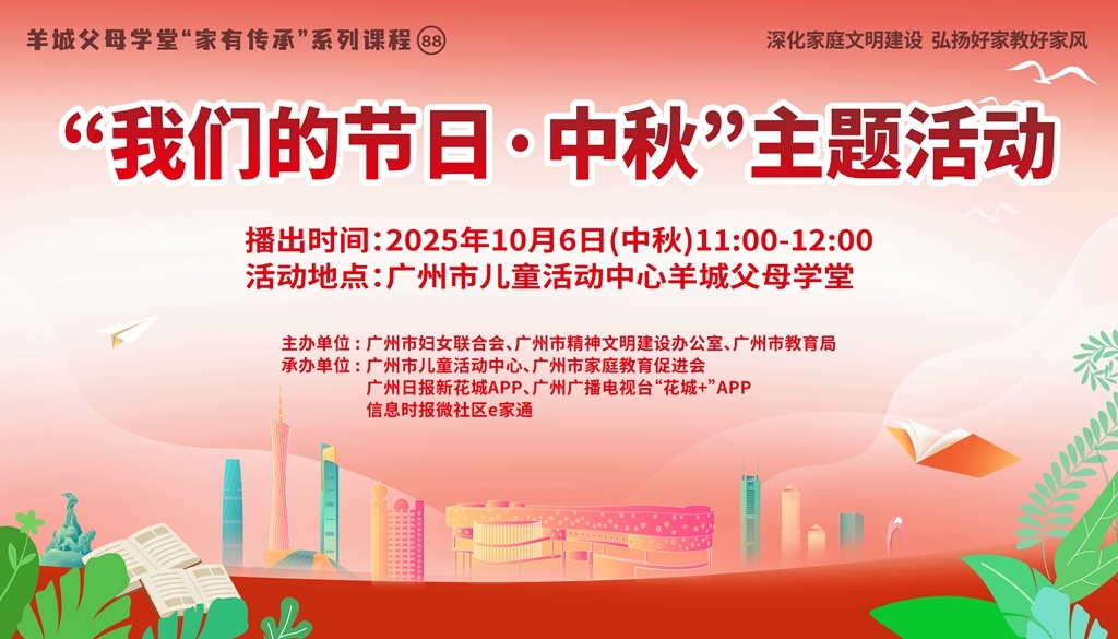 欢迎广大市民通过新花城App、花城+App、微社区e家通和大洋网在线观看,共同在中秋的文化故事里,与孩子一起读懂中秋的“前世今生”,向孩子传递感恩、和睦等家庭美德,悄悄培育起温暖的家庭文化氛围。